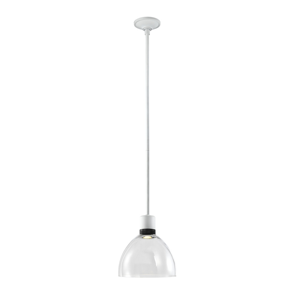 10" High End Clear Glass Dome Shade Pendant Light in Our Chic Matte White Finish with Detailed Satin Brushed Black Diamond Knurled Metal Band. Integrated Replaceable LED with 3CCT 3000K, 3500K and 4000K.