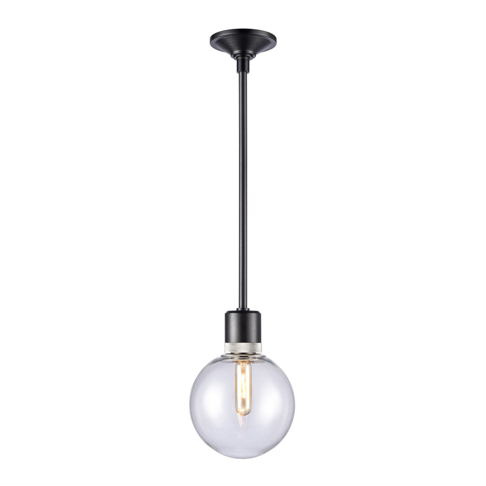 8" High End Clear Glass Globe Shade Pendant Light in Our Sleek Satin Brushed Black Finish with Detailed Polished Nickel Diamond Knurled Metal Band. E26 Medium Base Socket for 12" T10 Filament LED Bulb Not Included.