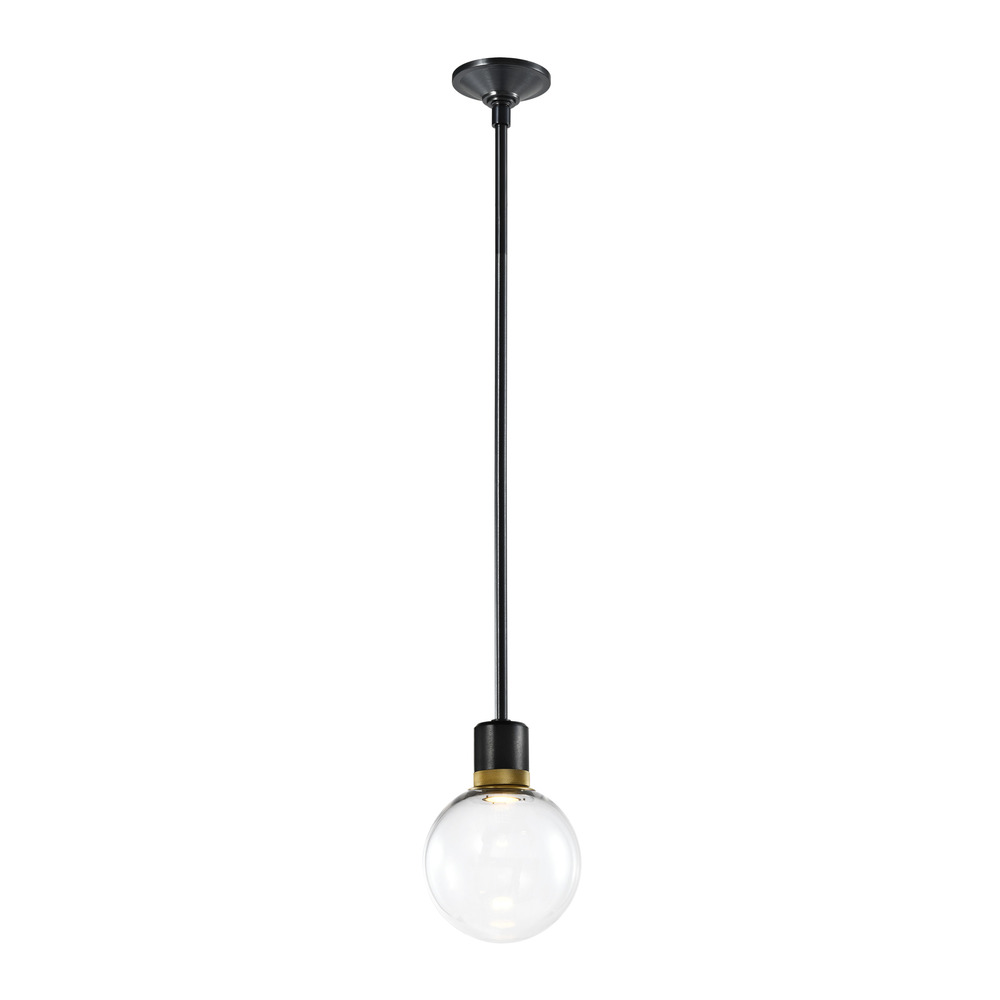 8" High End Clear Glass Globe Shade Pendant Light in Our Sleek Satin Brushed Black Finish with Detailed Aged Brass Diamond Knurled Metal Band. Integrated Replaceable LED with 3CCT 3000K, 3500K and 4000K.