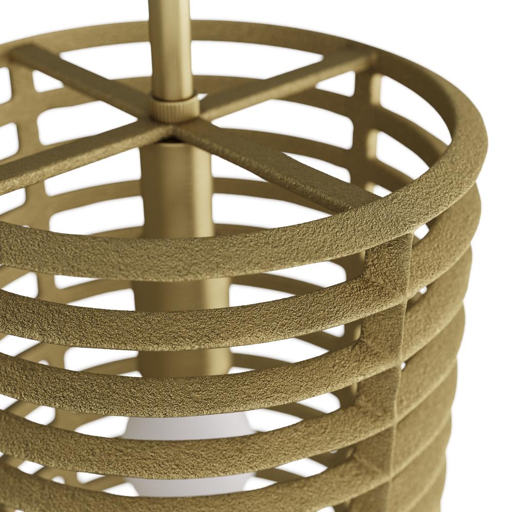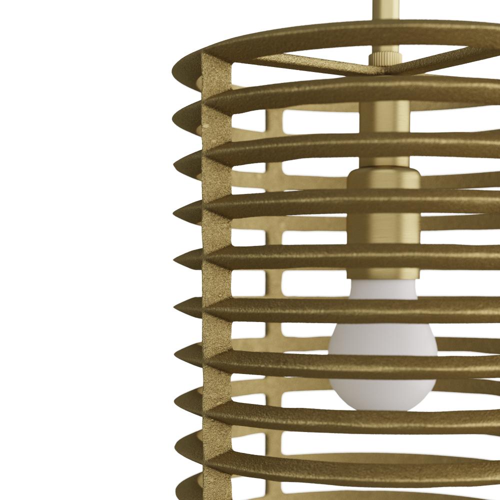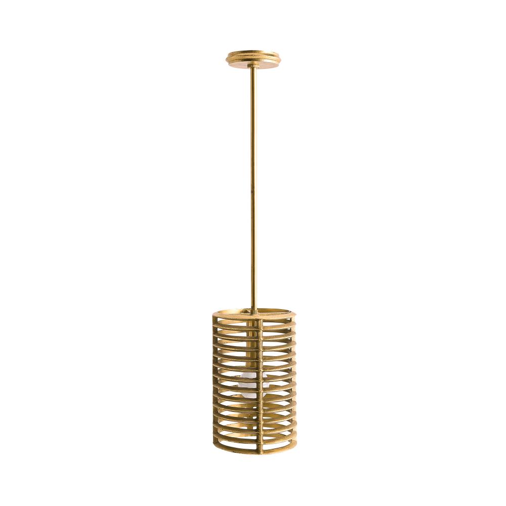 Ridged rings of cast aluminum finished in antique brass spiral and suspend to create a radiator-like effect. Suspended by a simple antique-brass finished iron pipe, and encasing a single bulb, this industrial-inspired pendant offers a play on light. Damp-rated, although limited covered outdoor conditions may affect finish. Finish will vary.