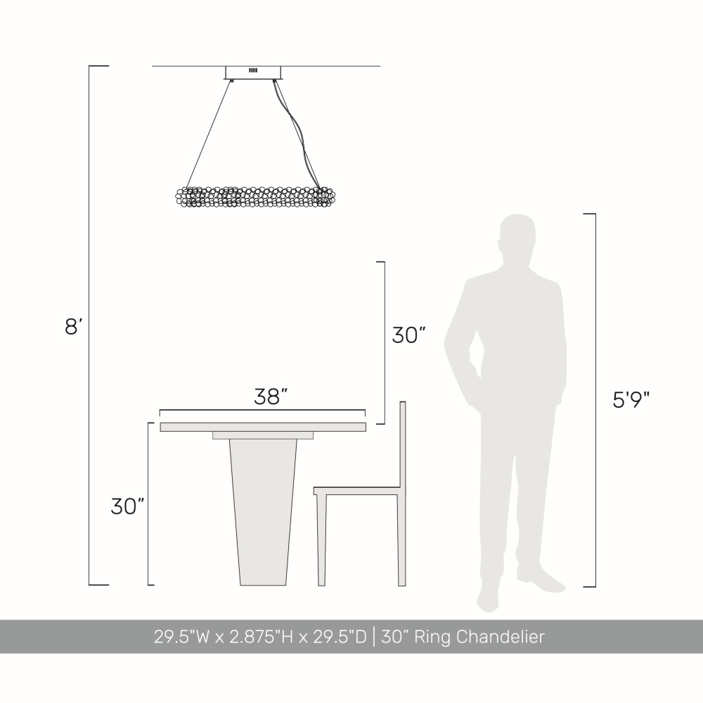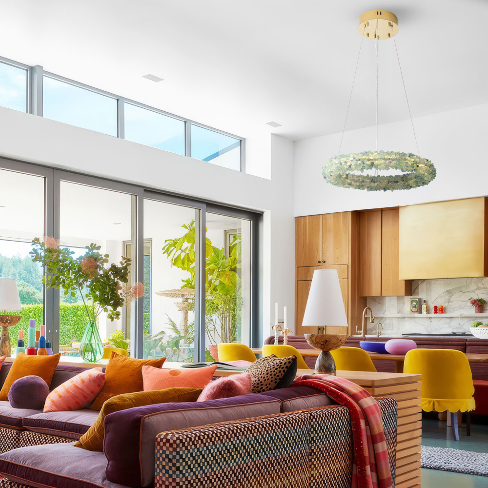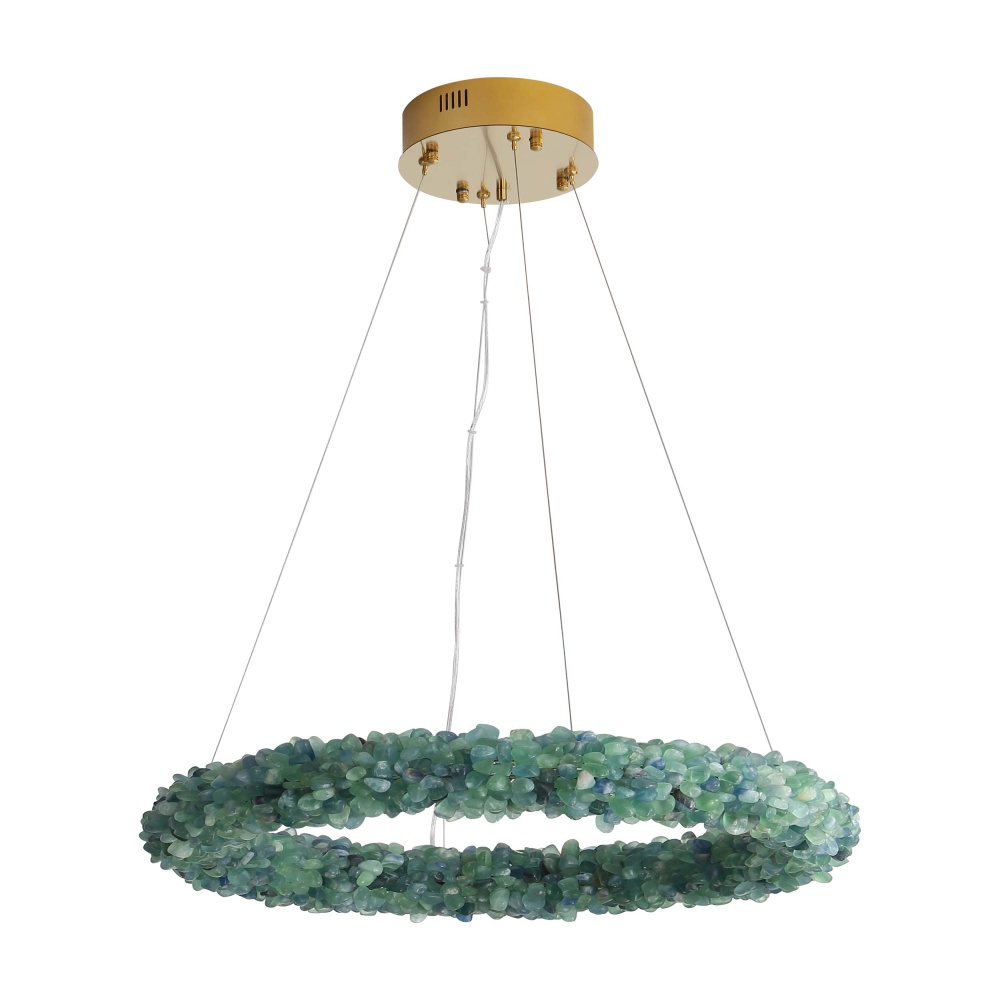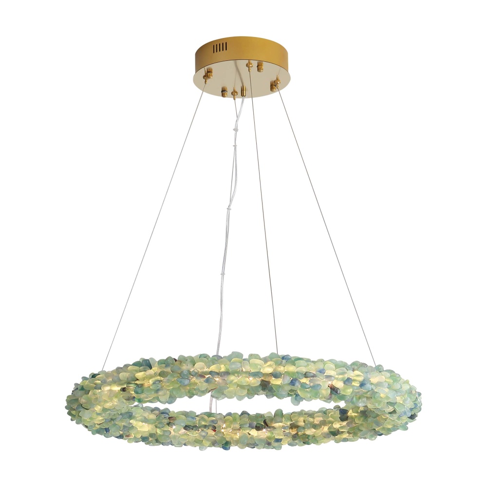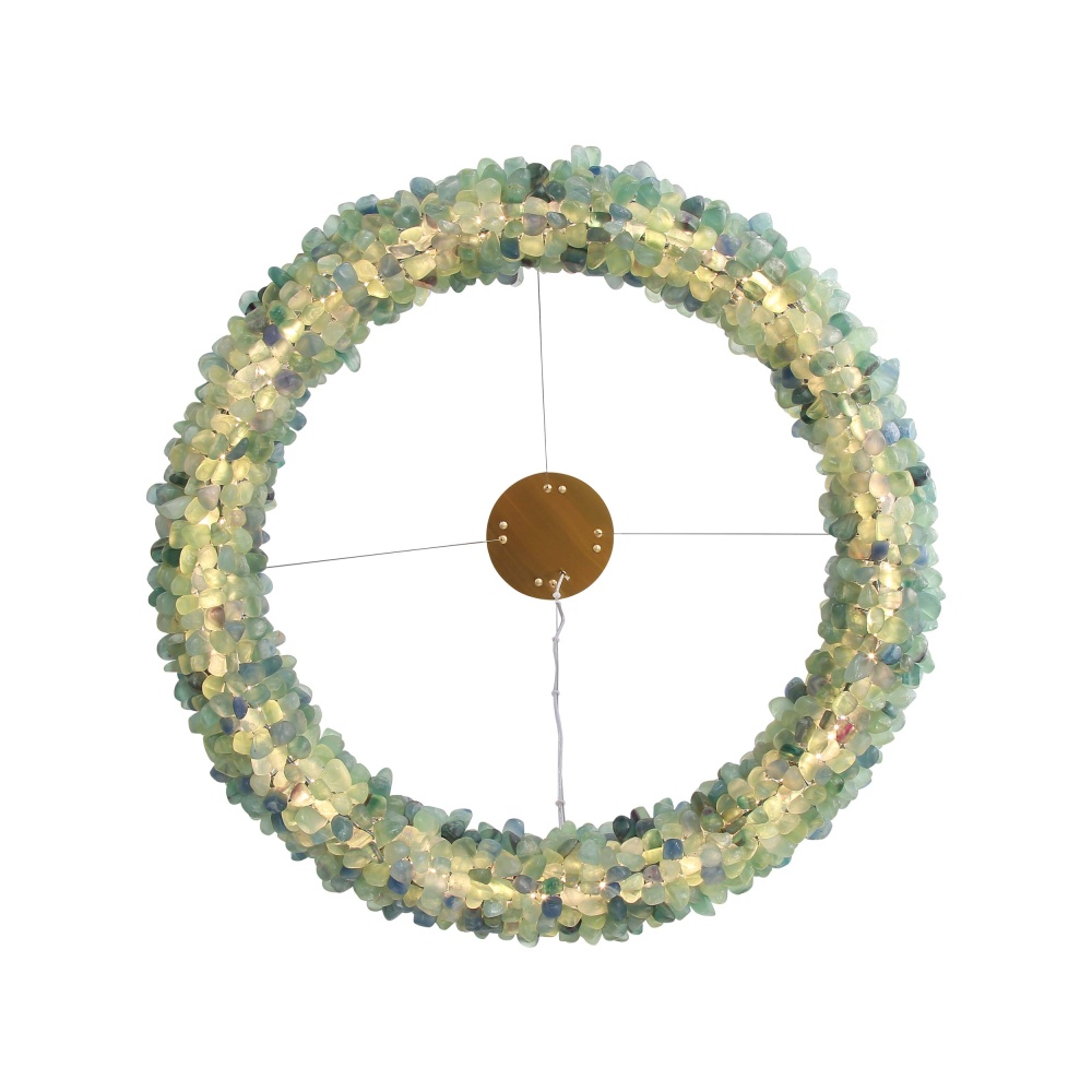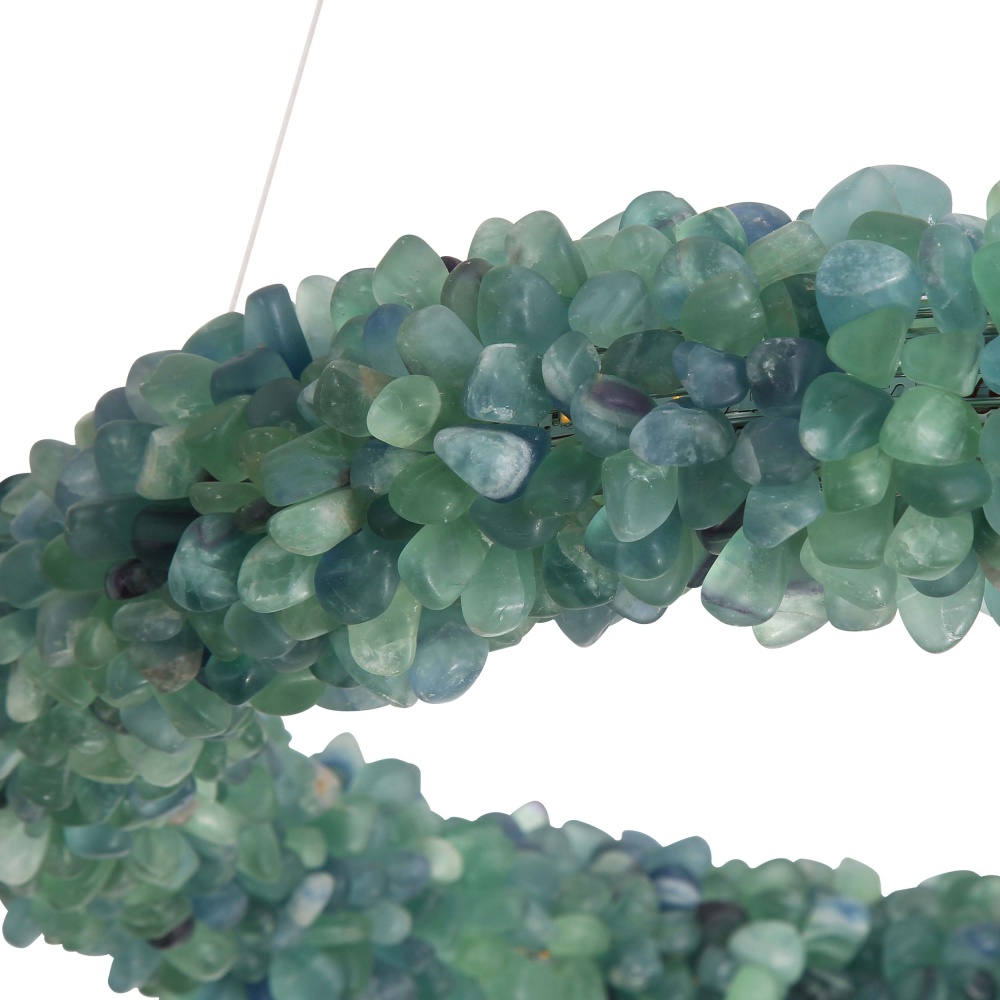 Bring nature-inspired elegance into your home with the Ziva by Golden Lighting Corallo Integrated LED 30in Chandelier. This stunning piece features handcrafted green fluorite crystals, creating a unique spectacle that illuminates your space without the use of shades. Each of the carefully arranged tumbled gemstones boasts a mesmerizing spectrum of seafoam greens, blues, and hints of violet, reflecting the tranquil beauty of ocean reefs. The illuminated center adds a soft, ethereal glow, making the chandelier a captivating focal point for any room. Perfect for dining rooms, foyers, and living spaces, this chandelier is dry location rated for indoor use. Its installation is effortless with sloped-ceiling compatibility and adjustable heights ranging from 13.75" to 145.625". Overall Dimensions: 29.5"W x 2.88"H x 29.5"D. With integrated LED technology providing 6444.42 rated lumens and a warm 3000K CCT, your space will feel welcoming. Make a statement with this one-of-a-kind chandelier that celebrates the organic beauty of natural gemstones.