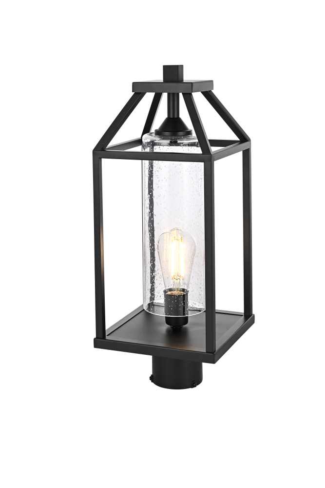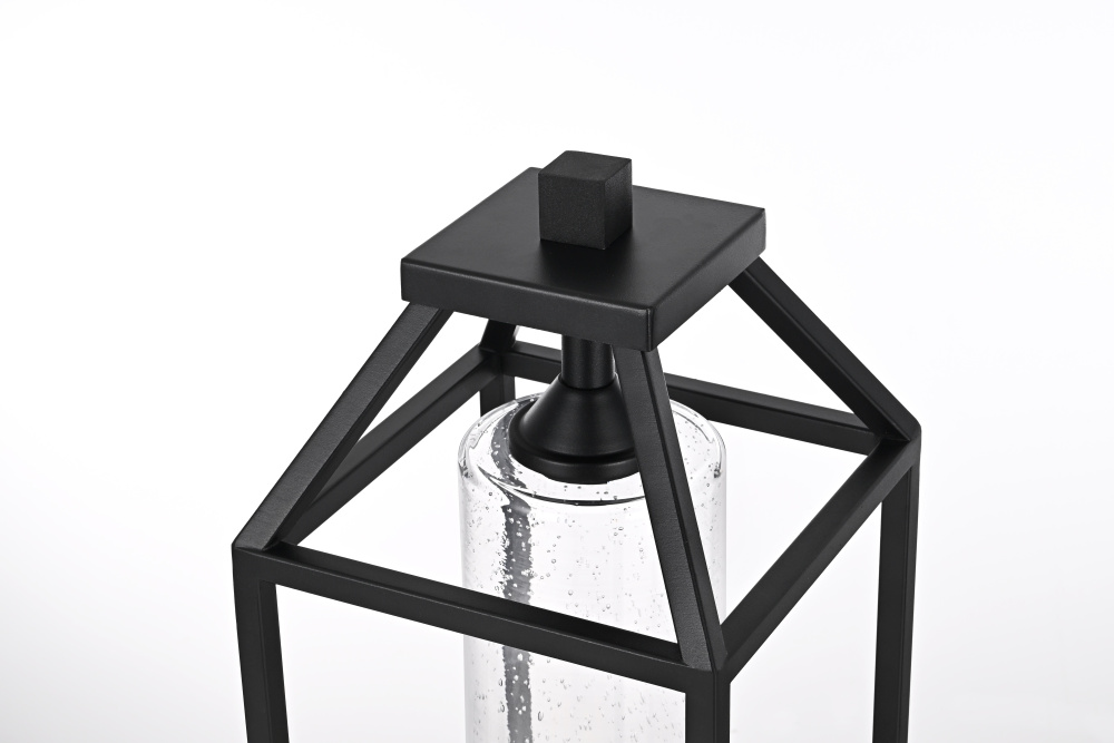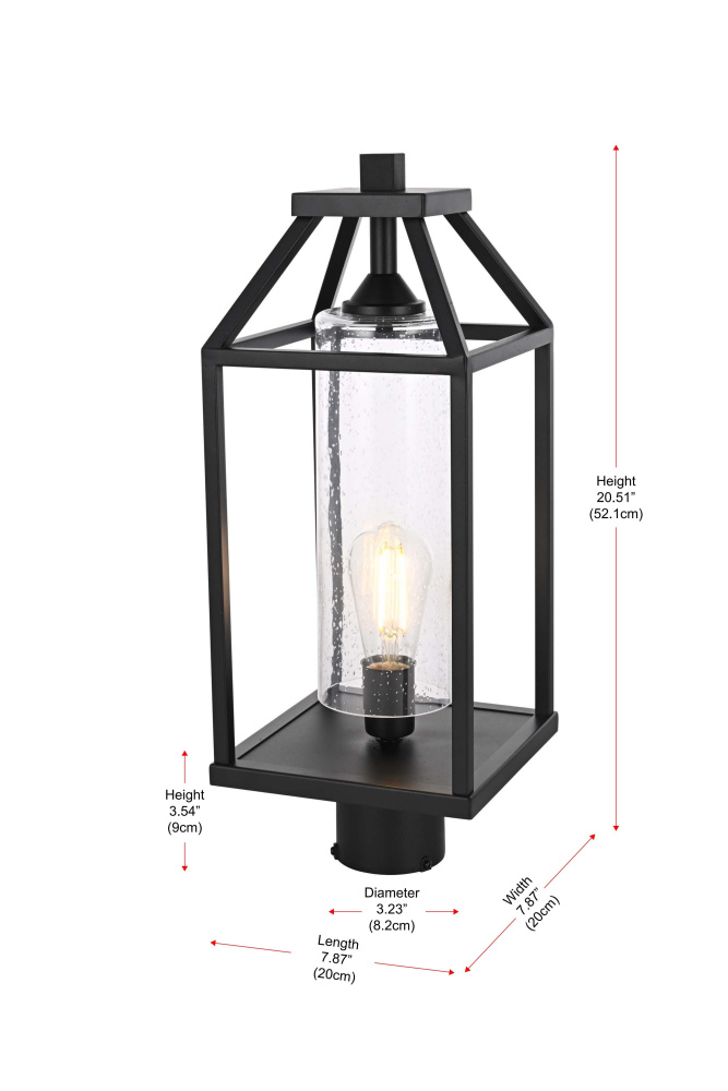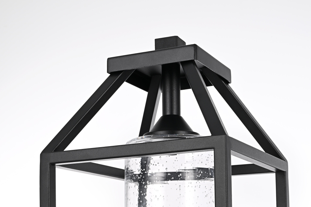 This post light brings a bold, geometric presence to outdoor spaces with its open rectangular frame and peaked roof design. The clear seedy glass cylinder inside enhances the light output while adding subtle texture, creating a dynamic visual effect. Crafted from iron and aluminum, the durable black-finished frame ensures strength and weather resistance, making it ETL Wet Rated for driveways, walkways, and garden landscapes. The 3.23-inch wide base fits most standard post light poles (pole not included), making installation straightforward. This fixture is dimmable and requires one medium-base E26 bulb (not included), offering flexibility in brightness and bulb selection. With a structured frame and thoughtful material choices, this post light blends modern form with practical outdoor lighting solutions. Built with marine-grade, corrosion-resistant aluminum, this sconce withstands coastal conditions for long-lasting durability.